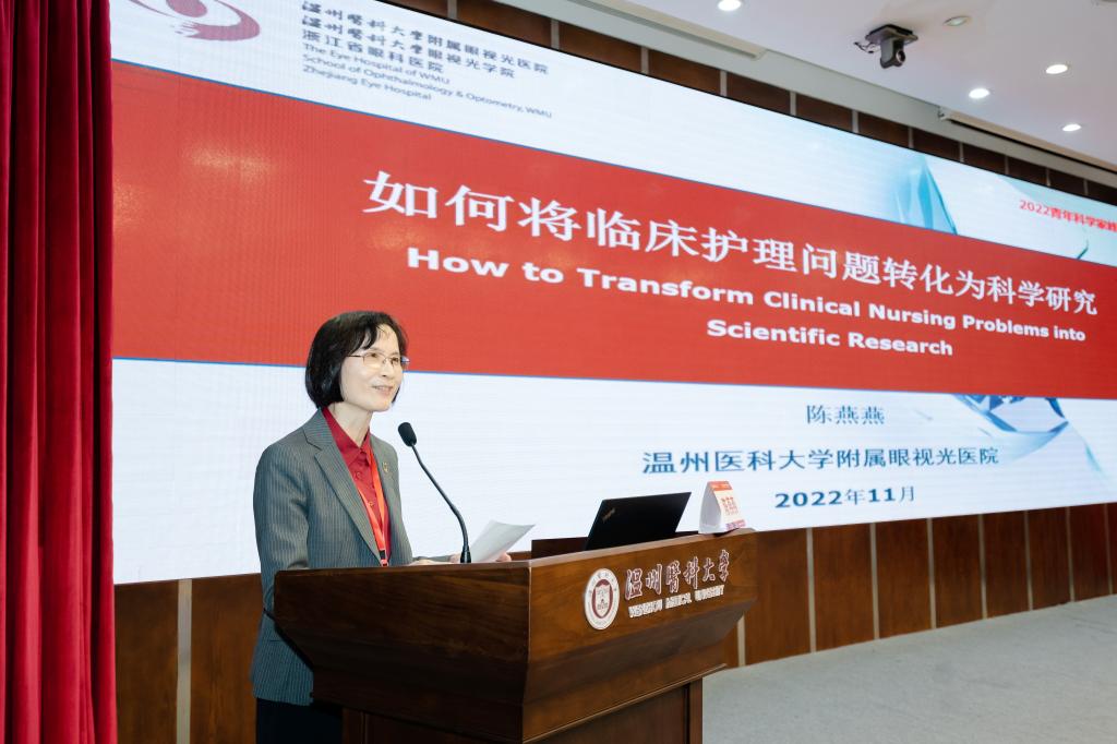 中华护理学会眼科护理专委会副主任委员、附属眼视光医院原党委书记陈燕燕教授作《如何将临床护理问题转化为科学研究》的主旨报告。她引用大量课题项目中的案例,针对“护理问题从哪里来”“如何将护理问题上升为科学问题”“如何将临床护理问题转化为科学研究问题”进行了详尽解答,鼓励护理人员用评判性思维审视临床工作,让大家在护理科研方面深受启迪。
