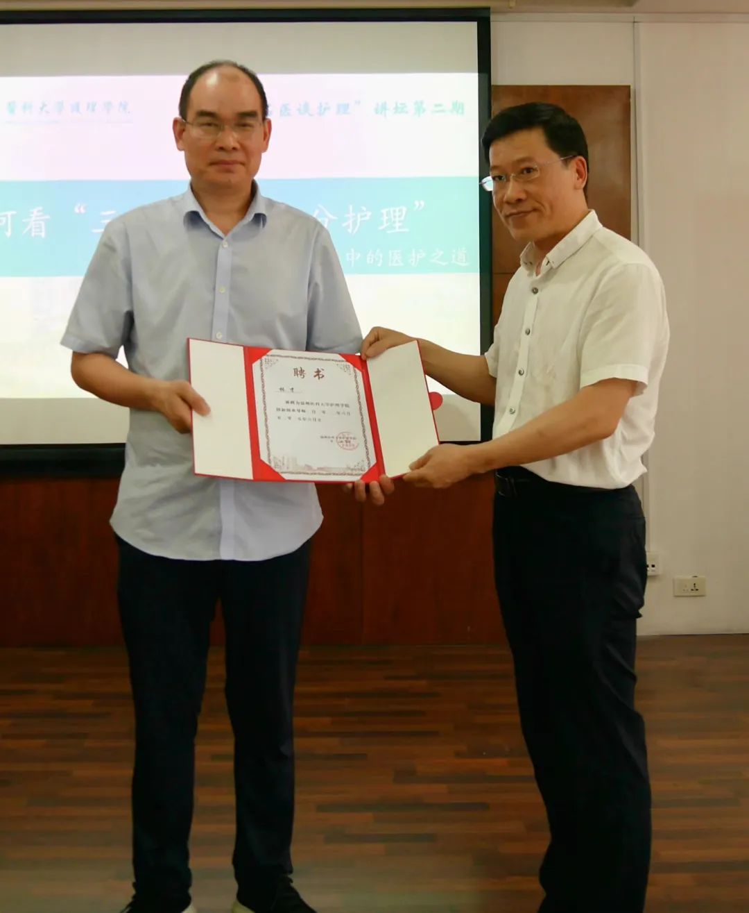 6月17日下午,肉漫屋 在茶山校区同心楼六楼会议室开展了名医谈护理第二期“如何看‘三分治疗,七分护理’——烧伤创面修复中的医护之道”专题讲座。主讲人为温医大附一院烧伤伤口中心主任林才老师,党委书记李旭东老师,党委副书记陈素云老师出席此次讲座,肉漫屋 学生积极参与。讲座正式开始之前,学院特聘林才老师为肉漫屋 创新创业导师,学院党委书记李旭东老师为潘教授颁发聘书!