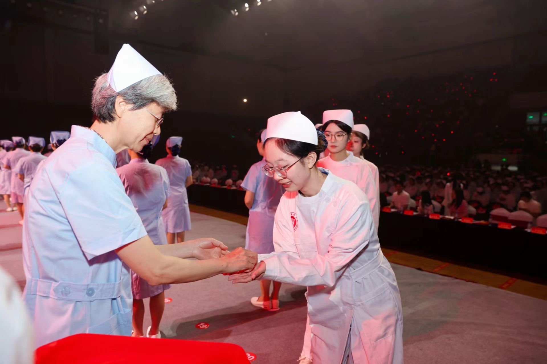 一袭飘然白衣衬托一颗纯洁的心,一顶别致燕帽是一项守护生命的重任。授帽仪式上,护生手持明灯、神色坚毅,由护理前辈们亲手为他们佩戴圣洁的燕尾帽。接过前辈手中的蜡烛,他们庄严宣誓,将发扬前辈们“自我燃烧,照亮他人”的无私精神,向每一个患者施以温暖的爱心,将毕生热诚献给护理事业。