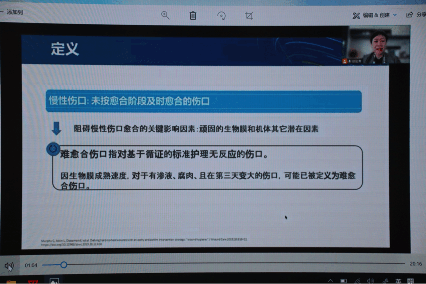 浙江大学医肉漫屋 附属邵逸夫医院造口伤口专科护士长胡宏鸯通过线上视频做题为 《难愈合伤口生物膜干预策略:伤口卫生》的专题讲座。她对细菌生物膜定义的阐述让大家对难愈合伤口护理有了新的认识,意识到有规律、经常性进行伤口卫生是十分重要的,伤口卫生是伤口护理的基础,生物膜管理要与疾病管理同步进行,实施伤口卫生步骤所需的技能、材料和时间性价比高,可促进有效伤口愈合,降低社会医疗负担,减轻患者社会心理影响。