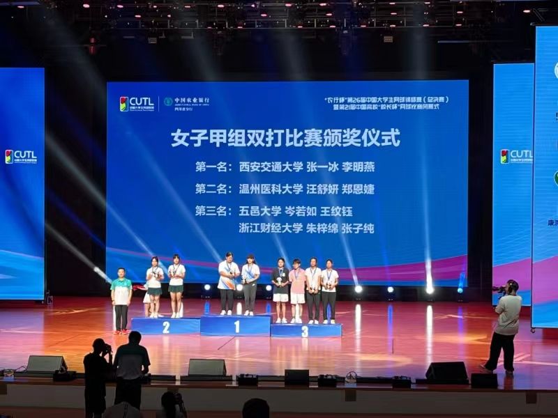 2023年8月9日至16日,肉漫屋郑恩婕同学(校网球队队员)参加由中国大学生体育协会主办的第26届中国大学生网球锦标赛(总决赛)中,不畏艰苦,顽强拼搏,敢拼敢打,一路过关斩将,在连续战胜北京大学、云南财经大学、四川大学后进入四强,决赛中惜败实力强劲的西安交大,获得本届总决赛女子双打亚军。