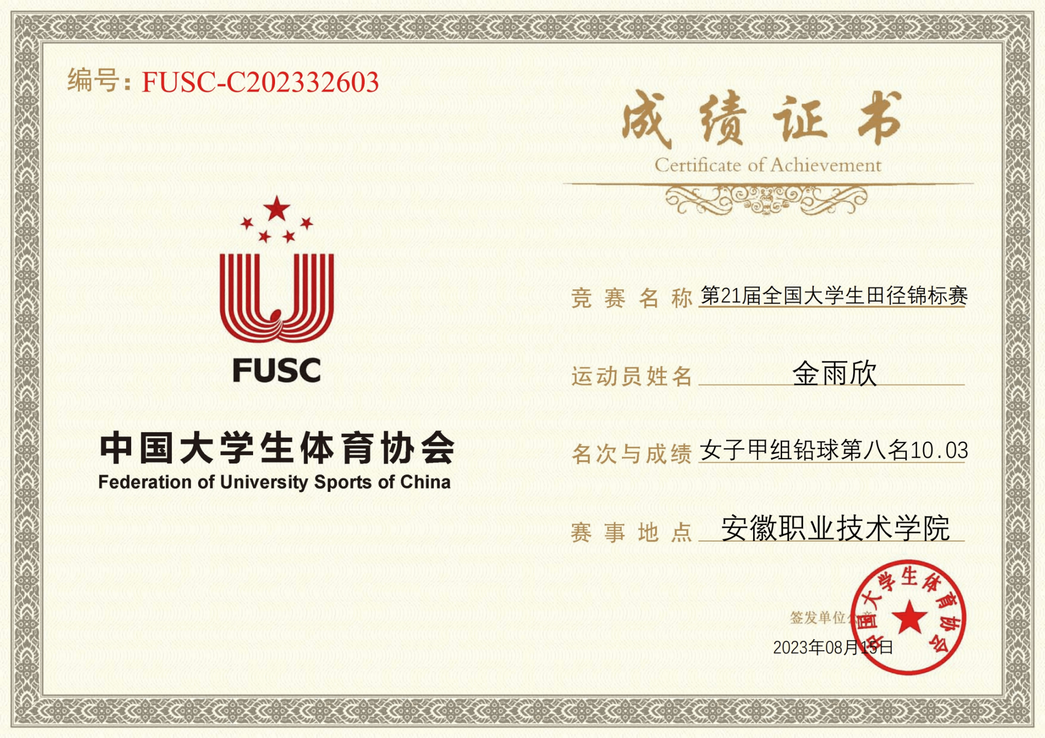 2023年8月10日—16日,肉漫屋健儿金雨欣同学(校田径队员)参加由中国大学生体育协会主办的第21届全国大学生田径锦标赛中,她顽强拼搏,最终以10.03米的成绩取得第八名,创造我校田径历史。全国田径锦标赛成绩是评价高校体育工作的一项重要指标。