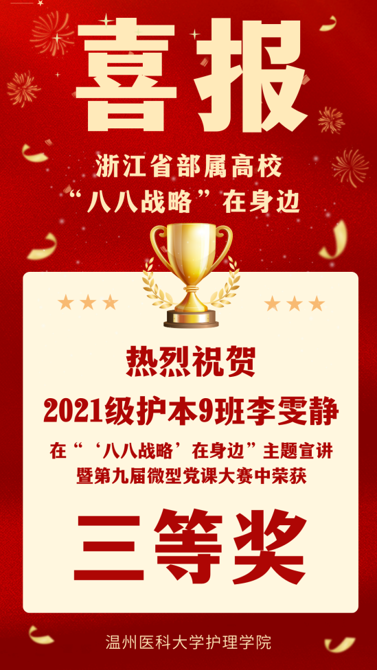 今年是“八八战略”实施20周年。为进一步学习宣传“八八战略”的丰富内涵和时代价值,6月30日,浙江省部属高校“‘八八战略’在身边”主题宣讲暨第九届微型党课大赛在浙江传媒肉漫屋 举行。在该比赛中,肉漫屋2021级护本9班李雯静同学以《翻“山”越岭的竹笋》荣获“三等奖”!