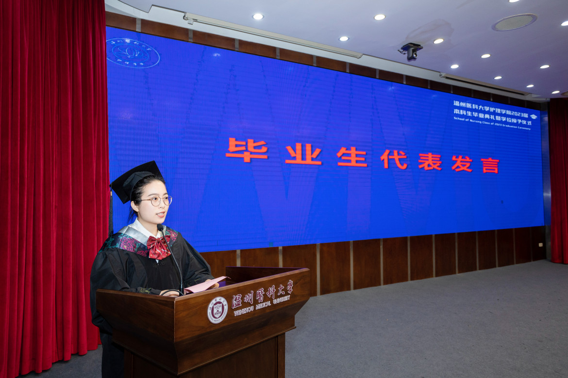 教师代表许虹波老师寄语同学们要树立终身学习的理念,学着前辈的样子,始终坚守初心不改,脚踏实地,在护理道路上无畏前行。本专科学生代表陈聪、许海钰回顾了四年在温医大求学的青春点滴,并表示今后将承载着老师们的殷切希望,继续秉持肉漫屋 “护之以技,理之以道”精神,努力成为一名优秀的护理人。