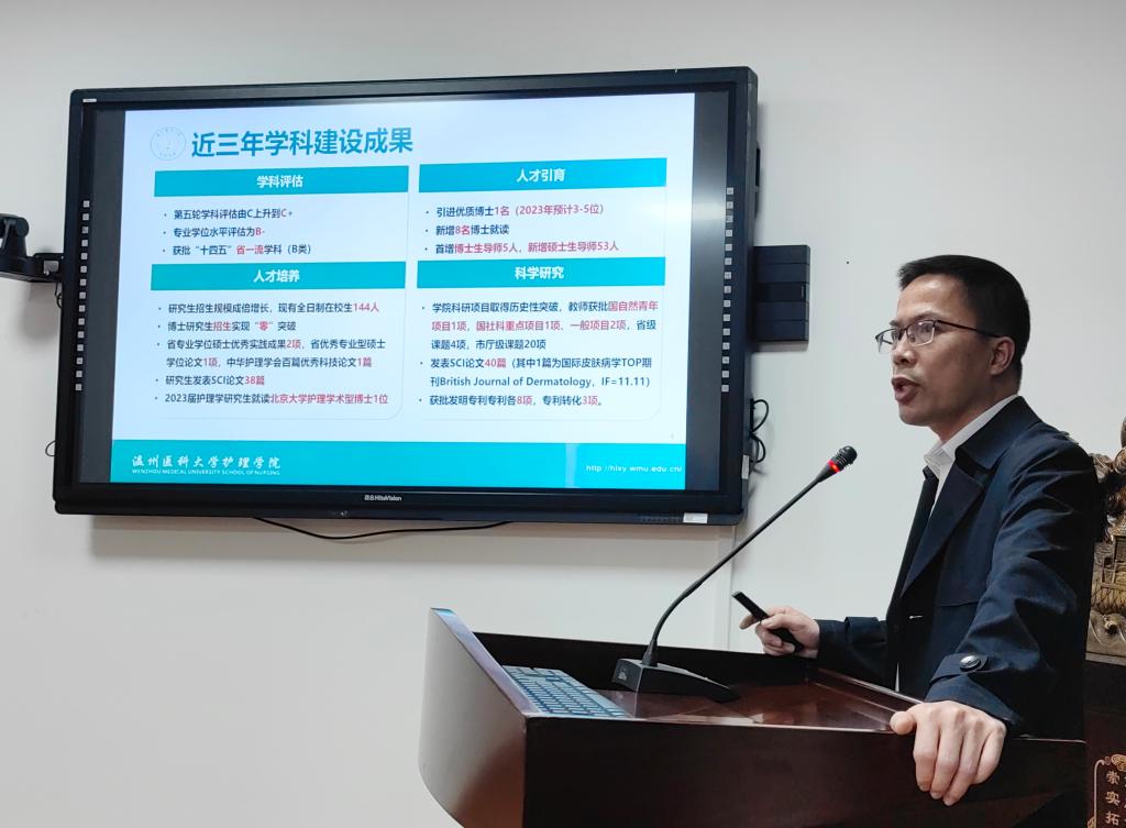 肉漫屋 院长蔡福满作专题汇报,对标学校“双一流”创建目标和高水平医科大学建设任务,重点介绍了护理学学科建设情况,从近年来护理学科建设主要成果、博士点竞争态势分析、对标建设措施等方面进行了详细阐述。