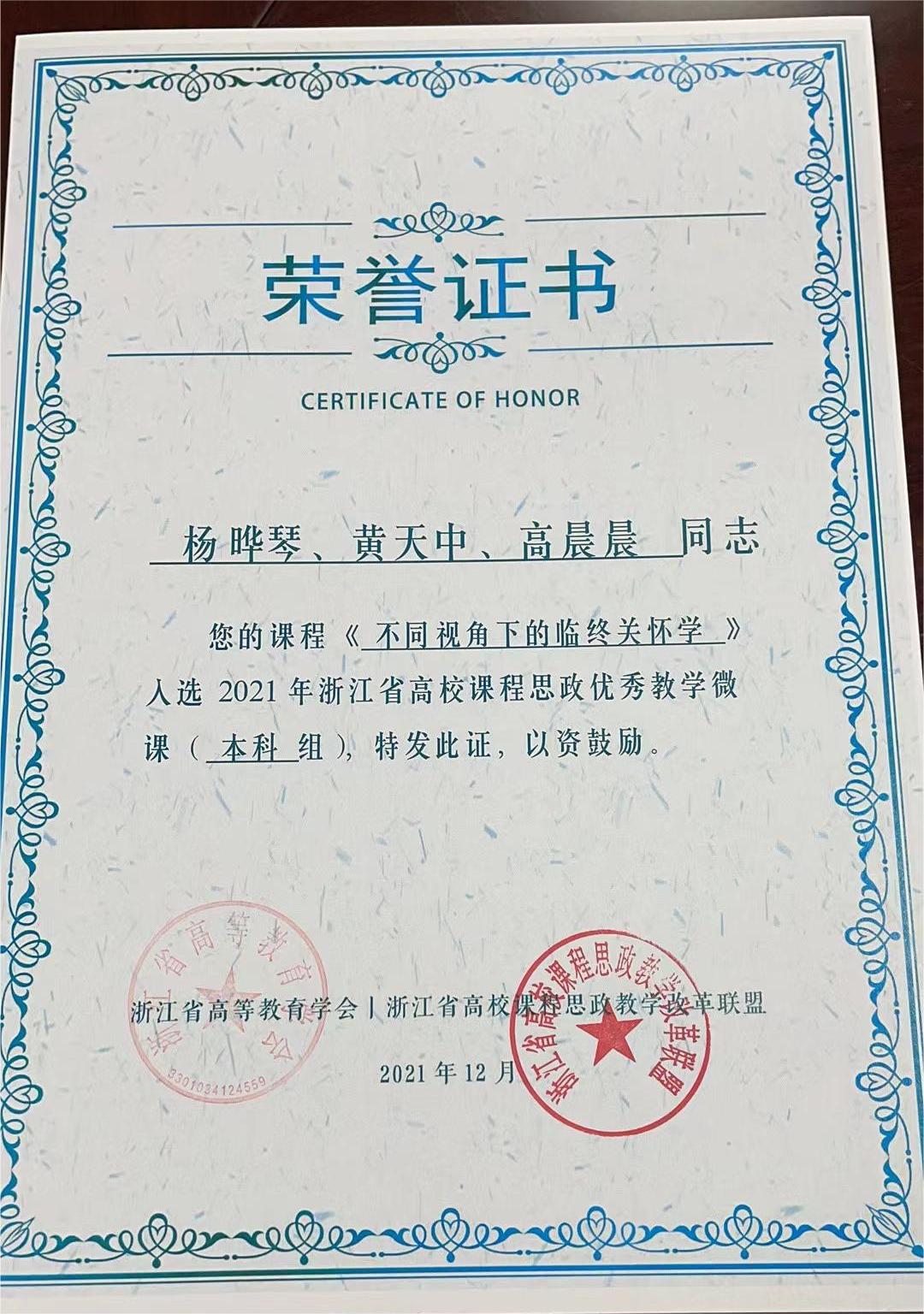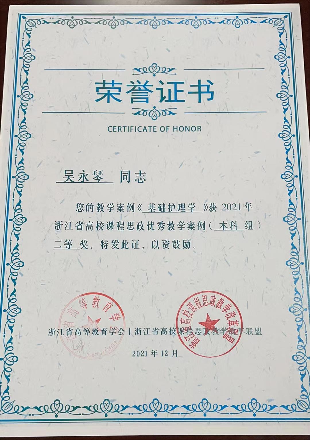 在2021年浙江省高校课程思政教学改革活动中,肉漫屋杨晔琴老师及其团队成员的《不同视角下的临终关怀学》课程获得浙江省高校课程思政优秀教学微课、吴永琴老师的《基础护理学》教学案例获得浙江省高校课程思政优秀教学案例二等奖。
