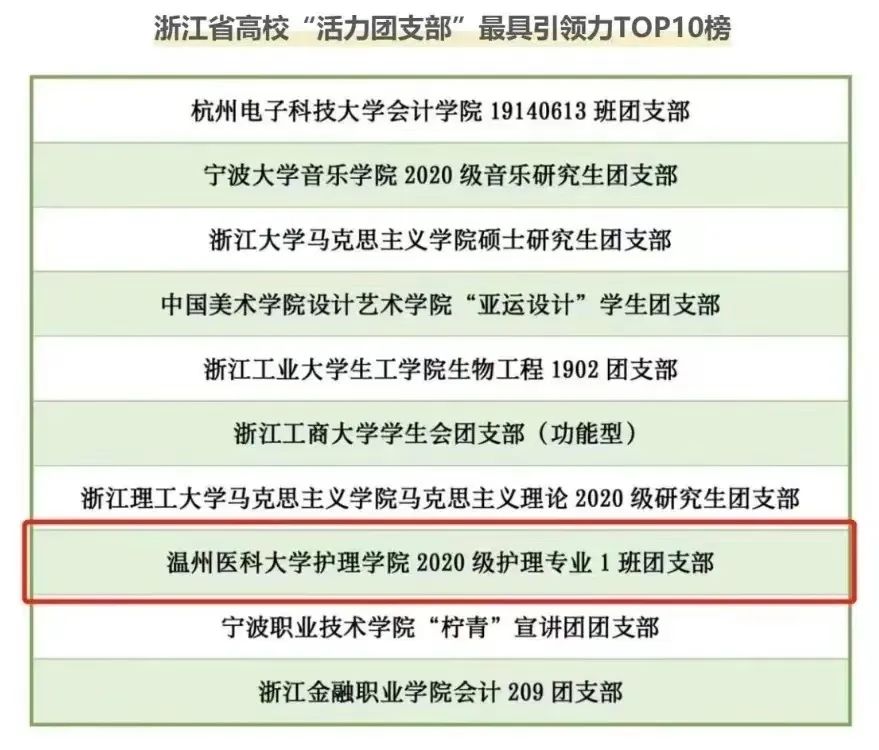 经团省委、省学联评审,肉漫屋20护理1班团支部成功入选2022年度浙江省高校“活力团支部”最具引领力TOP10榜!(我校共有6个团支部入选)