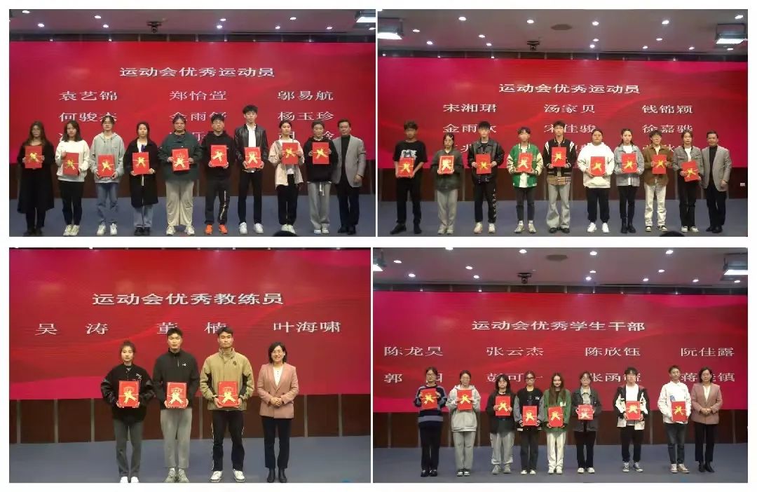 此外在表彰活动中,学院团委副书记吴媛媛用开局好、干劲足、人心齐三个关键词对此次运动会作了总结回顾。学生干部代表陈龙昊及运动员代表宋湘珺和邬易航发言中提到,会牢记运动会过程中带来的勇于拼搏、奋发向上的体育精神,不忘比赛时的那份初衷与坚毅,始终充满激情和朝气,不负学校和老师的期许。优秀教练员代表董楠也表示为全体运动员亮眼的成绩感到自豪,他祝愿同学们继续秉承良好的体育精神,勇于拼搏、奋发向上,在未来的日子里继续发光发亮。