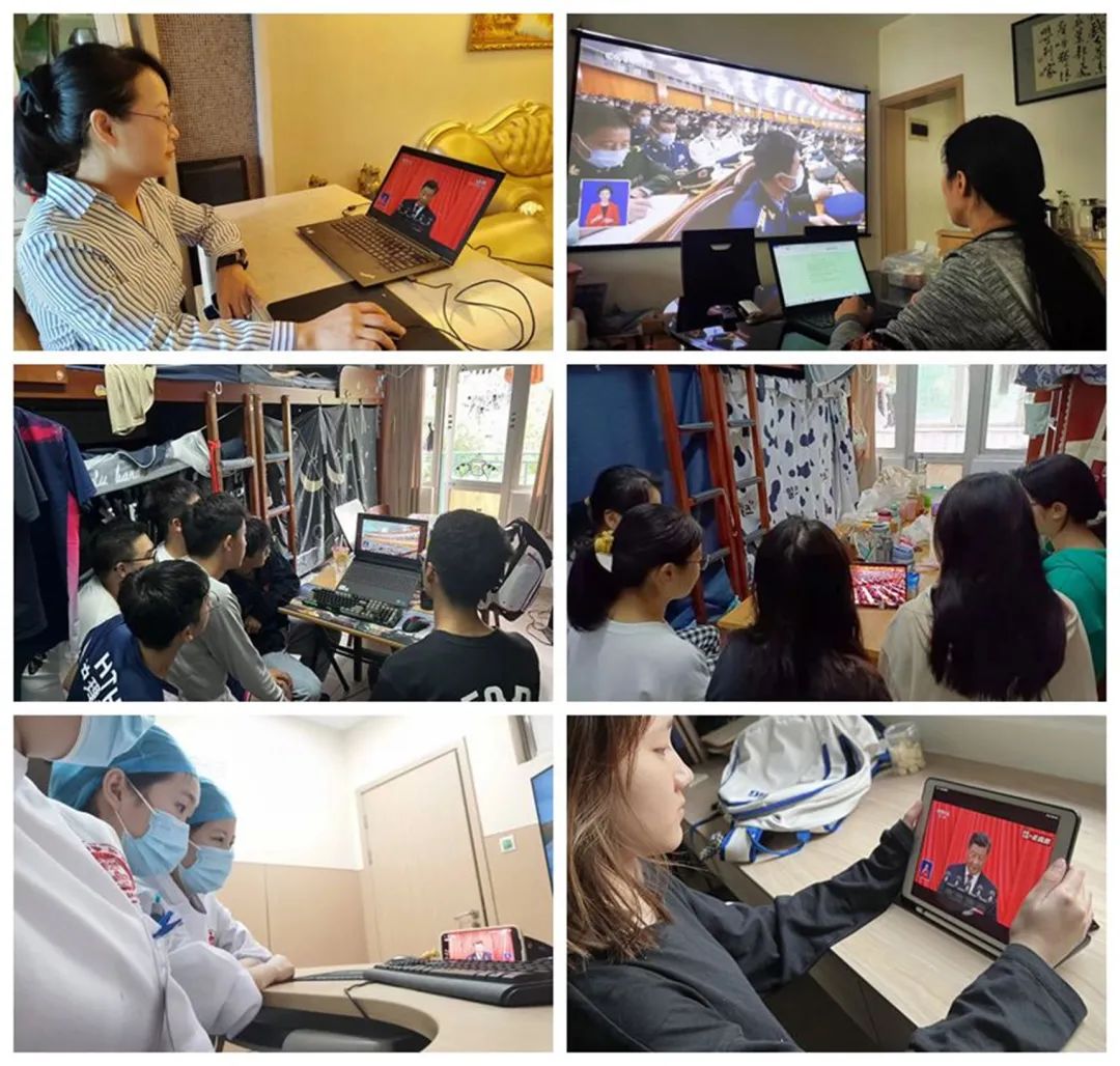 师生在家里、寝室、实习医院等地观看