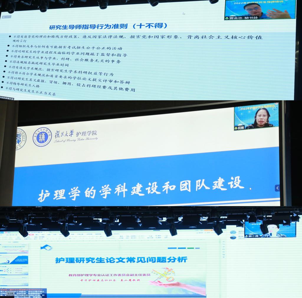 培训会上,王立生教授就加快建设研究生教育强国作专题讲座,针对新时代新理念新格局,阐述了建设研究生教育强国的新目标,传达了习近平总书记对研究生教育工作的重要批示,介绍了加快新时代研究生教育改革发展十大专项行动。教育部护理类教育指导委员会秘书长孙宏玉教授介绍了国外高级实践护士的培养,对比国内当前专科护士的培养路径,从我国未来高级实践护士的发展方向、教育标准和认证制度、与专业学位硕士研究生培养接轨、建立专业学位博士研究生四个方面提出我国高级实践护士的思考。