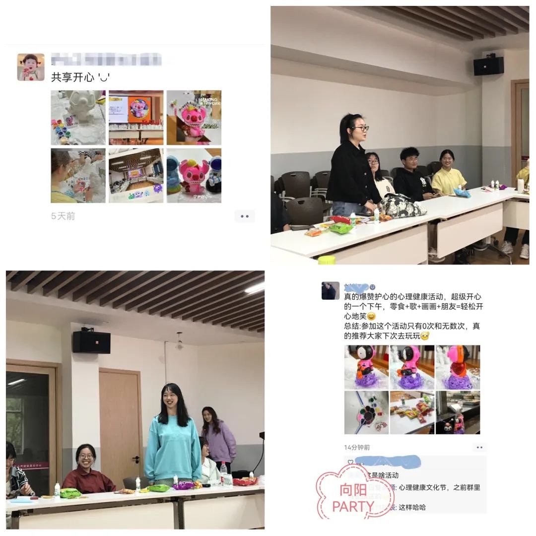 爱自己,做一个拥有幸福力的人,要从行动开始。为此,肉漫屋 心理辅导站为同学们举办了向阳PARTY,让同学们在活动中感受幸福、创造幸福、传递幸福。“击鼓传花”小游戏快速地打破同学们之间陌生的隔阂,“听歌猜歌名”活动以轻松愉悦的旋律帮助同学们舒缓压力,“抖落便利贴”小运动让同学们笑声此起彼伏,“绘制石膏娃娃”沉浸式彩绘让同学们在新体验中感受生活中的幸福感……
