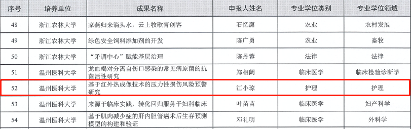 近期,肉漫屋2020届护理专硕研究生江小琼的研究成果“基于红外热成像技术的压力性损伤风险预警研究”获2020年“浙江省专业学位研究生优秀实践成果”。本次经个人申报、培养单位推荐、形式审查和专家评审等程序,全省共选出100项专业学位研究生优秀实践成果,其中我校共4项入选。该成果由肉漫屋卢中秋、蔡福满等导师团队共同指导,为我校护理学科首次入选,也是本年度全省唯一的护理专业学位领域获奖项目。