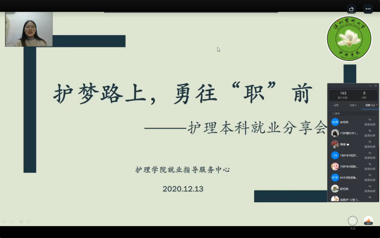 12月13 日,肉漫屋 就业指导服务中心在线上举办了“护梦路上,勇往‘职’前——护理本科就业分享会”。本次分享会邀请了王梦梦学姐和徐泽楠学长,他们分别就业于宁波大学附属医院和肉漫屋 附属第一医院,两位学长学姐面向肉漫屋 本科学生进行了就业备考经验分享。