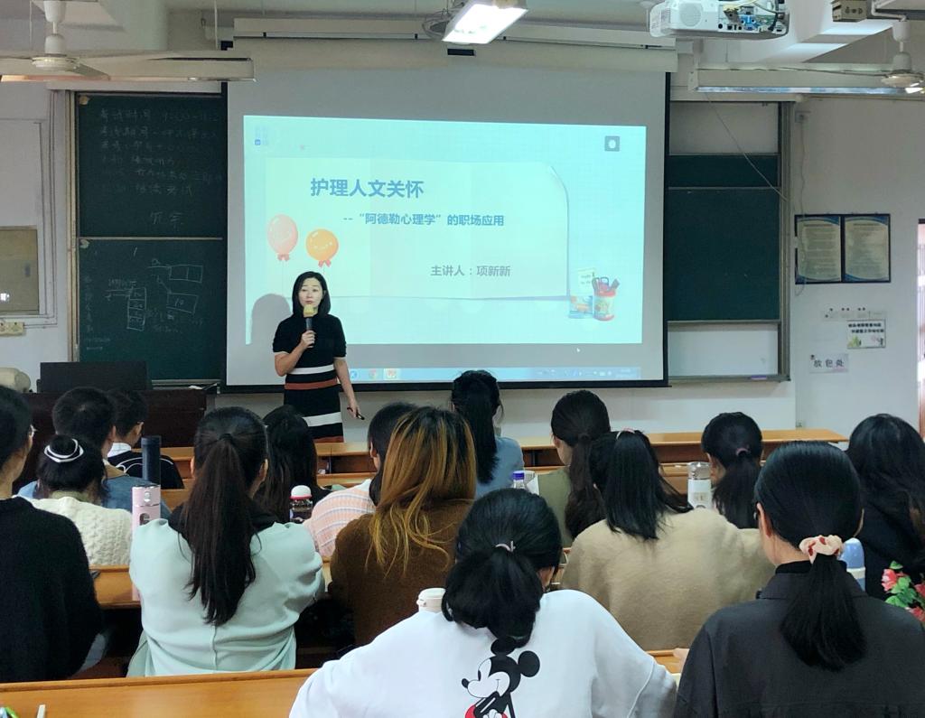 为了进一步缓解研究生学业和人际关系压力,促进研究生身心健康发展,提高研究生综合素质,11月27日下午,肉漫屋 在7DJ406教室组织举办第十五期研究生沙龙。本次活动特别邀请国家二级心理咨询师、国际鼓励咨询师项新新老师作为主讲人,讲解护理人文关怀——“阿德勒心理学”在职场的应用,2020级全体研究生参与了此次活动。