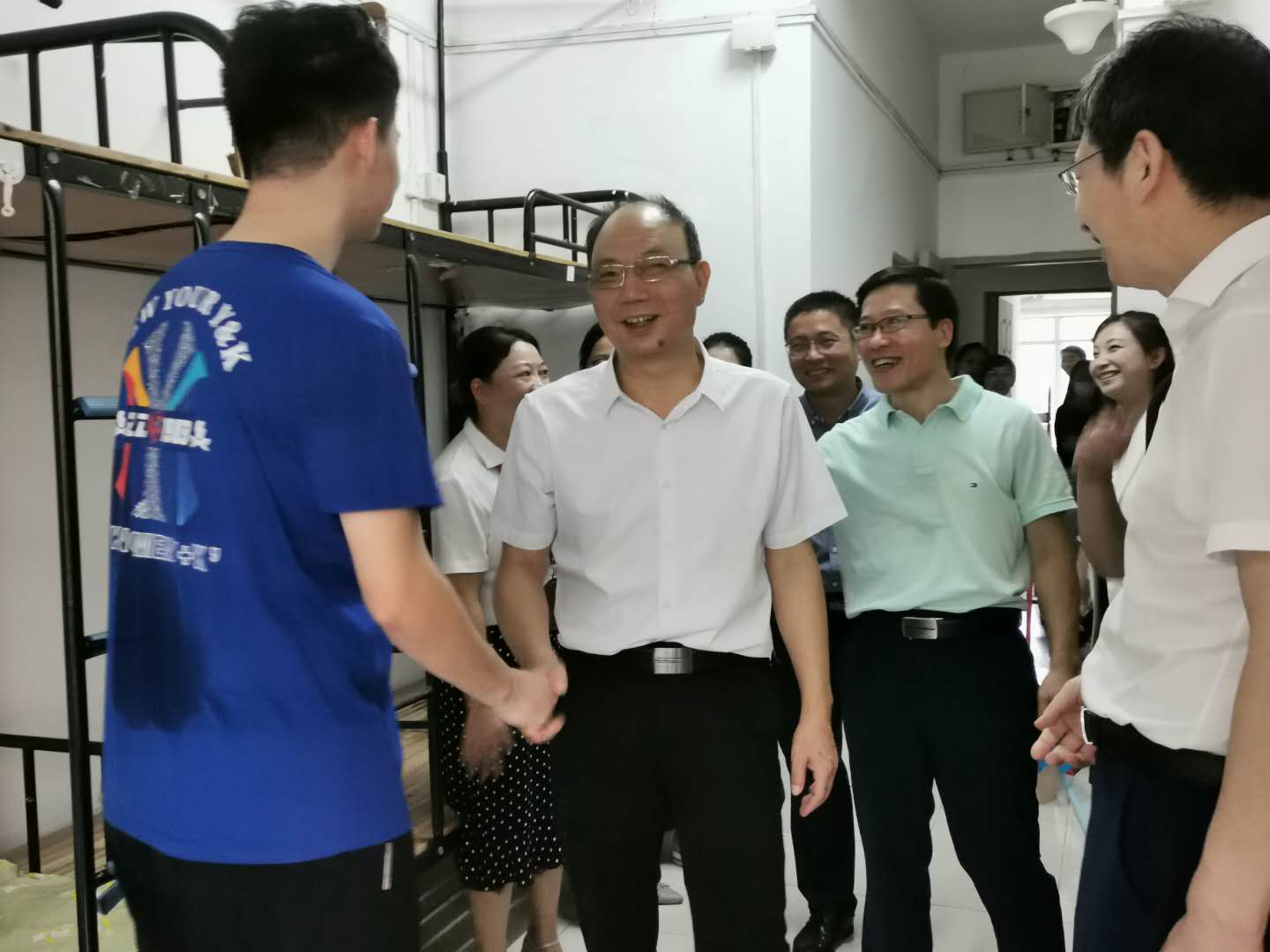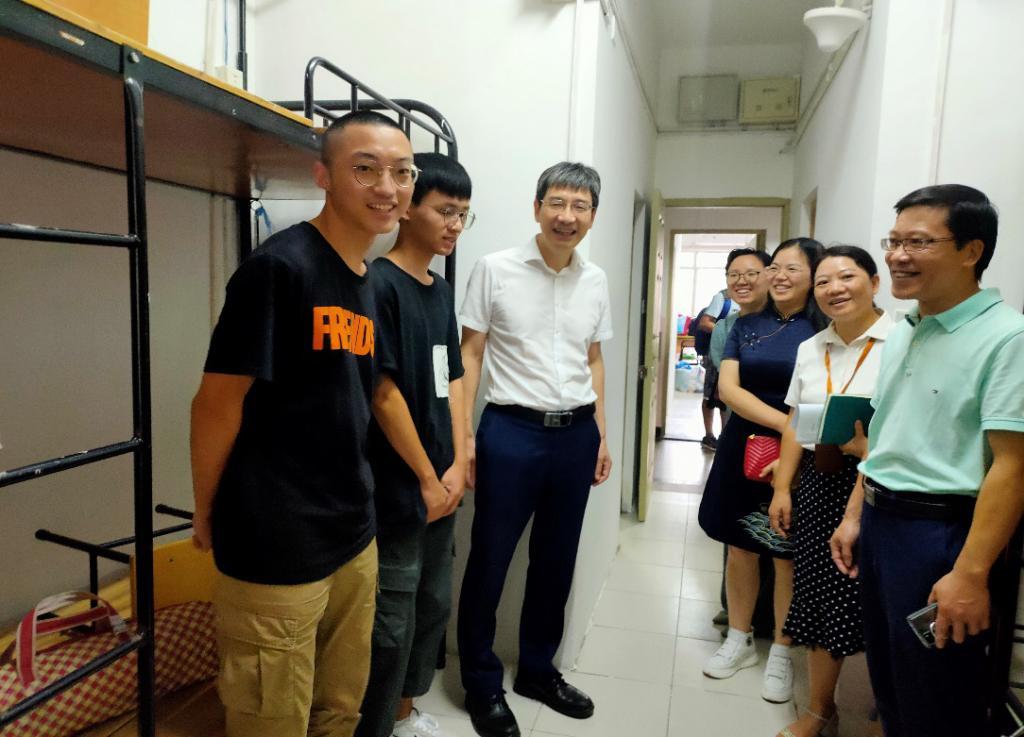 上午10:00,校党委书记吕一军、院党委书记李旭东、院长陈成水及班子成员、肉漫屋 学工办、团委老师和新生辅导员到达迎新现场和学生寝室看望新生。“老家是哪里的?”“东西收拾的怎么样了?”,校领导吕一军亲切询问新生勉励大家说:“爸妈不能陪同进校,有好处也有坏处,坏处是要自己整理,好处是这样可以让同学们尽快的独立起来,适应大学生活,融入大学校园。”当吕书记看到肉漫屋今年新生中不乏男孩子的身影,很是赞赏说到:“护理专业不是仅仅适合女孩子,男孩子也非常的适合,在医院里男护士是非常稀缺的,医院里有很多重要的特殊的护理岗位”。新生们热情地和老师们打着招呼,“我家就在温州,我自己选的护理专业,很开心能做一名护士。”“还没参观过我们学校呢,我要抓紧去看看!”同学们纷纷表达来到温医内心的喜悦和憧憬。