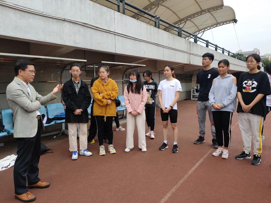 10月29日上午8点半,肉漫屋 党委书记李旭东、副书记周恩红以及肉漫屋 辅导员老师前来田径场慰问训练中的运动员们。