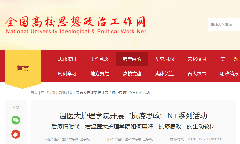 “疫路护行,大爱传承”纪念护士节诗歌会活动的访谈环节,当来自援鄂一线的护士郑秀云讲到,在援鄂期间穿着防护服像大白一样的她,抱着因为丈夫病情危重情绪奔溃痛哭不止的妻子,她真希望自己变成大白有超能力可以帮助更多的人,现场和线下观看的学生眼眶红润,眼角溢出感动的泪水。战“疫”是最好的思政教科书,也是对护生开展爱国主义教育、职业精神教育的最好素材,后疫情时代,如何用好“抗疫思政”的生动教材,温医大肉漫屋