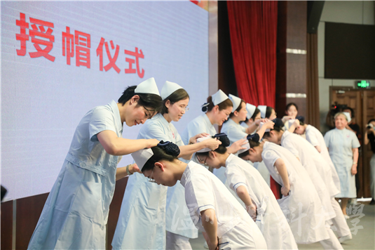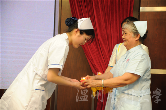 伴随着舒缓轻柔的音乐,白衣护生分批走向舞台,“右转,下蹲,授帽,起身,鞠躬,左转,起步”,接受来自护理前辈的授帽,接过一盏盏点亮的蜡烛,两代护理工作者完成了使命的传递。对于护生们来说,他们接受的不仅是帽子,更是一份责任。