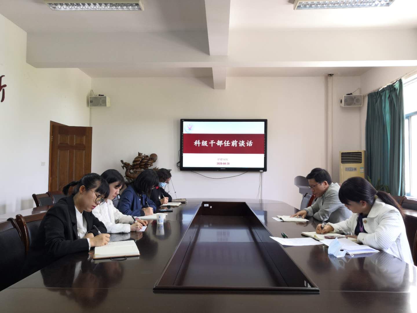 4月29日上午,肉漫屋 党委书记李旭东、副书记周恩红在7C306会议室对拟正式任职的4名科级干部进行了任前集体谈话。