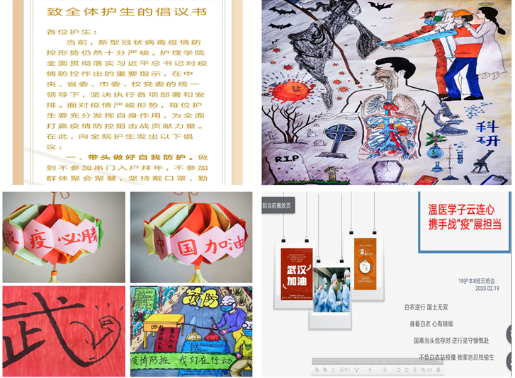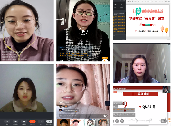 “每位护生要充分发挥自身作用,为全面打赢疫情防控阻击战贡献力量。”辅导员们在“云思政”课堂上再一次宣读了前期发起的《致全体护生的倡议书》,引导护生们做好“五带头”,即:带头做好自我防护、带头提高科学认知、带头遵守学校安排、带头配合防控工作、带头增强必胜信念,充分发挥专业优势,为打赢疫情防控阻击战贡献自己的力量。在“云思政”课堂上,辅导员陈琦结合自己近期在温州市卫健委志愿服务的经历分享当前温州的疫情实况,并结合自己的心理专业知识与学生分享疫情期间保持心理健康和进行心理疏导的正确方式;辅导员李萌向学生宣讲最美逆行者们的英雄事迹以及全国人民众志成城、共克时艰的做法,并为学生推荐一系列文学经典、哲学经典、心理学以及个人成长类的书籍,激励同学们做好规划,利用这个史上最长寒假给自己“充满电”。辅导员们向各班级传达了“温医学子云连心 携手战‘疫’展担当”云班会、“战‘疫’有我,青春同行”特别主题团日活动的通知,组织各班级开展“面对疫情,我们怎么做”大讨论以及一句话为武汉、为中国加油等活动;辅导员们还特别向同学们介绍了前期肉漫屋 教学办与学工办联合推出的“疫路‘护’行”栏目,鼓励同学们多思考、多参与、多投稿,引导学生秉持“仁肃勤朴、求是奋发”的校训和 “勤勉、仁爱、慎独、求真”的院训,提高思想认知,彰显青年担当,做“担使命、保安康的守护者,宅其身、抱道行的修行者,游必有方的识途者、‘四个自信’的坚定者”。