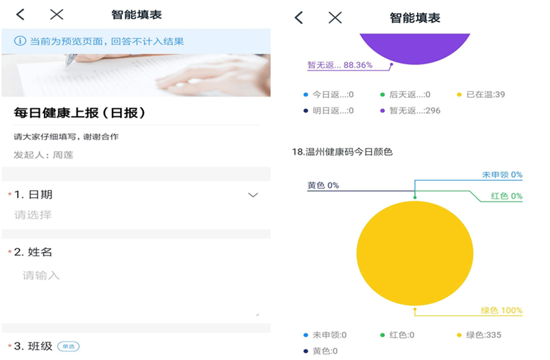 “当前,正处于打赢疫情防控阻击战的重要阶段,根据温州市委的部署,各级各类学校延期至3月1日之后开学,在开学前,所有同学不能返校……”辅导员们再三跟学生强调在3月1日之前,不在温学生不返温、在温学生不返校,并一再提醒学生减少外出,注意防护。同时,辅导员们结合前期通过钉钉、问卷星等平台制定的《每日健康调查问卷》的内容,提醒学生每天填写问卷进行打卡,每天两次如实上报自己及家人的身体身体状况,并强调如有特殊情况及时与辅导员联系,确保每天及时掌握学生信息。同时,辅导员们面向全体学生讲解“温州健康码”的领取方式和使用方法,确保健康码领取率100%。为考察学生对疫情的认知,辅导员王茹新还在“云思政”课堂上设置了“疫情知多少”问答环节,给学生们线上解答《2020新型冠状病毒防治统一考试(全国卷)》的内容,得到了学生的一致点赞。