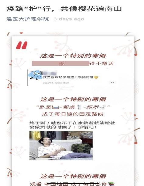 疫情对于护理学生的职业成长来说是一个应激事件,需要积极引导才能有助于他们的成长。肉漫屋 系统设计了疫情思政教育。第一,与课程思政相结合。人文护理教研室主任陈军老师带领教师们整合心理、伦理、沟通、职业素养等课程知识,进行疫情专题教育;另外,肉漫屋 要求所有课堂有疫情思政引导。第二,与思政课程相结合。教师和辅导员合作开展“疫路护行”主题竞赛活动,让学生主动思考,疫情当前,护生的责任和使命是什么?能为疫情做什么?作品以漫画、动画、抖音、微视频等形式呈现。第三,英雄事迹的宣传和引导。要求全体教工及时宣传有关护理的抗疫英雄事迹,做好职业教育。