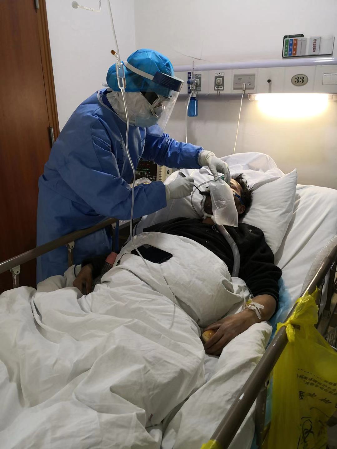 陈叡喆,2017届护理学子,我校附属第一医院护士,1月22日收到医院通知后立即通过护士长报名,2月7日加入医院一线抗疫队伍,被分配在隔离重症病房。每天,他会提前到达病房,照顾轻症患者的生活起居,同时密切观察他们的心理变化,做好心理护理;协助重症患者翻身拍背如厕测量体温,进行系统评估,密切观察生命体征、治疗效果,查看化验结果、血气分析和化验指标并正确记录,及时与医生沟通,还需做好仪器设备等的擦拭消毒。每天上班6小时加上换衣服脱衣服1小时,中途不喝水不上厕所不吃饭。下班后不回家前往专门为医护人员准备的生活区,像“住大学寝室一样”,为避免家人担心,他坚持每日报平安。