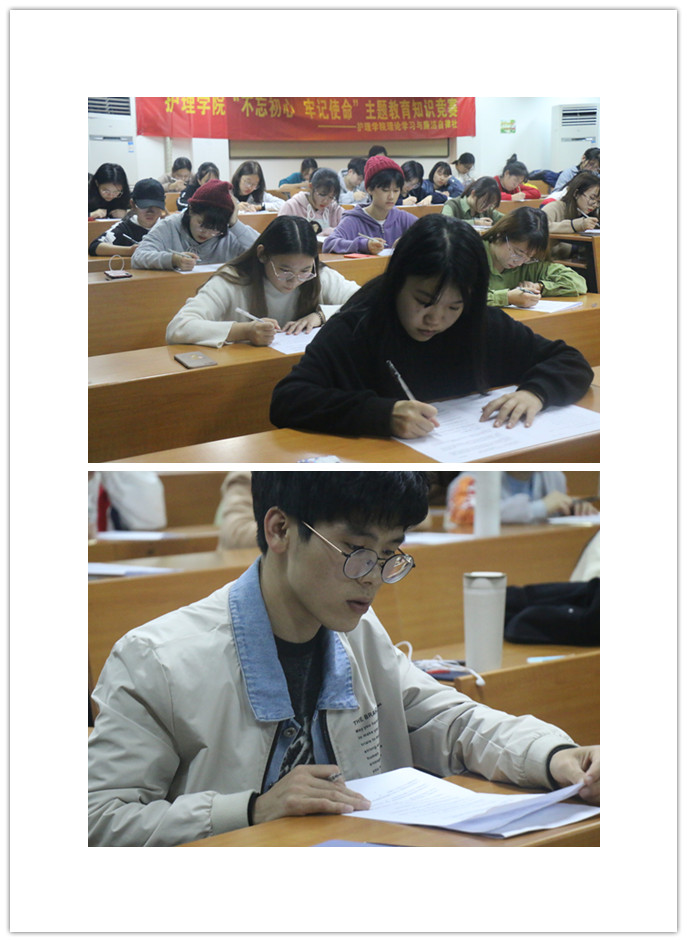 本次报名参赛者达70余位。比赛现场气氛紧张热烈,参赛选手精神饱满、思路清晰、认真作答,充分展现了肉漫屋 学子的良好精神风貌。还未拿到试卷时,同学们的表现千差万别。有的三俩攀谈,神采飞扬;有的独坐一处,自信满满。接下来进入正式比赛考试环节,一张两面的考卷,一人一隔的座位格局,三人来回巡考监考模式,一下子比赛气氛竟紧张了许多。抬头前方是屏幕上醒目的“不忘初心,牢记使命”八字箴言,后面是表情严肃的工作人员。经过近40分钟的比赛考试角逐,比赛圆满落下帷幕。赛后,工作人员加班加点批改试卷,经过裁判认真评分,最终三位同学获得一等奖、五位同学获得二等奖、12位同学获得三等奖。