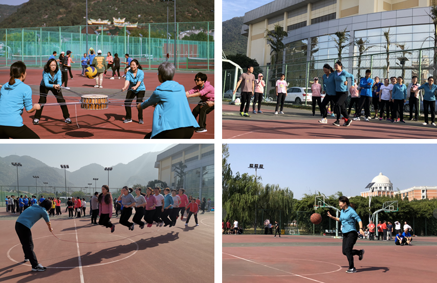 运动场上,教师们也斗志昂扬。集体跳长绳项目考量的是团体的默契度和配合度,2位摇绳的老师使出浑身的劲儿,随着绳子敲打着地面,8位跳绳的老师心里默数着节奏,一同起跳。“99,100,101……”加油和呐喊声中,老师们跳了109个,取得了团体第8名的好成绩。在2人3足接力赛中,肉漫屋 的老师们两两组队,一组队员一起迈步,一起喊口号,相互配合,默契地奔跑,相互鼓励,取得了第6名的好成绩。篮球运球投篮项目中,平时很少接触篮球的老师们也使出浑身解数控球、投篮,最终获得团体第10名。同心击鼓比赛十分考验团队的配合能力,老师们抓好连接着大鼓的绳子,调整着自己的力度和角度以鼓逐球,挥洒汗水,享受了运动带来快乐,结果显得并不那么重要。此外,梁洁华老师在女子铅球中获得第5名的好成绩。