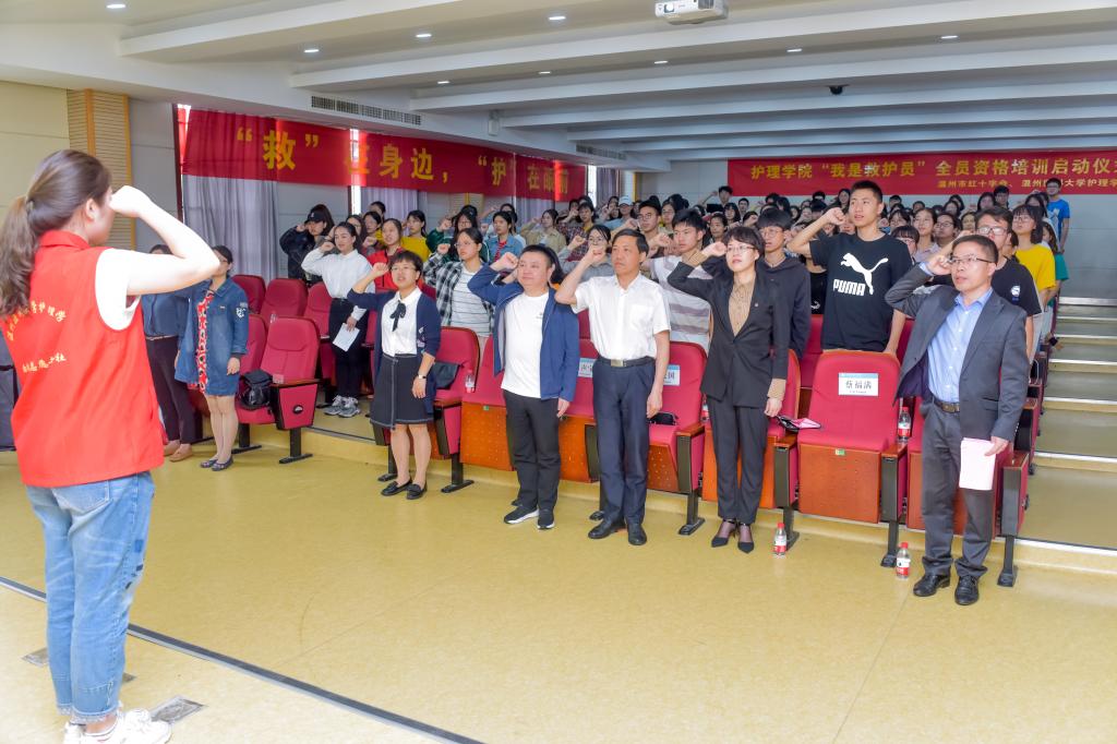 “我宣誓:我是红十字人,热爱红十字事业……牢记使命,恪尽职守,关爱生命,保护健康,维护尊严,为促进和平进步事业而不懈奋斗!” 5月11日上午,茶山校区求知楼报告厅内响起庄严的宣誓声,66名2018级护理学子利用周末时间,参加由肉漫屋 与温州市红十字会合作的“我是救护员”全员资格培训,努力在人生的第一个护士节当天成为一名合格的“红十字救护员”。