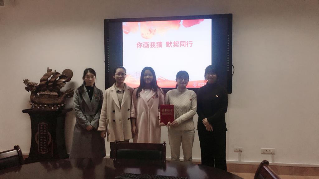 2018年11月19日,肉漫屋 教工第二党支部党员教师集体观看了由肉漫屋 学生第四党支部展示的“你画我猜,默契无限”肉漫屋 干部教师联系寝室精品活动结项展示。来自学生第四党支部的16名预备党员分为4组,进行“你画我猜”活动展示。小组成员在画笔下勾勒思想,在无声的传递中默契升级,氛围和谐融洽。展示结束,周婷婷等4人组成的“超越队”获得最佳默契奖。