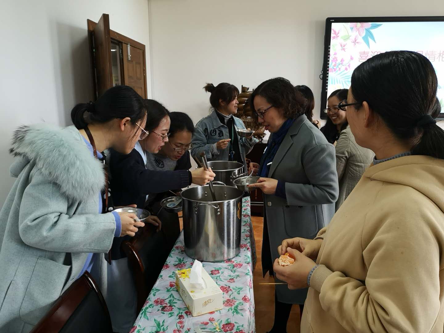 包裹温情的汤圆、夹着问候的水饺、满载健康祝愿的水果,浓郁甜馨,在舌尖与心间溢出满足和轻松。活动现场,音乐舒缓流畅,气氛温馨明快,老师们感受到冬至阳复的愉悦和期盼,其乐融融。