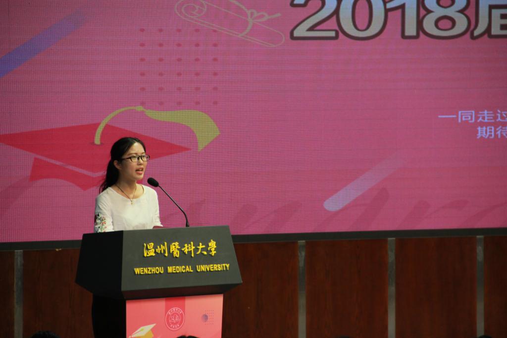 毕业生代表沈璐同学深深表达了对学校、肉漫屋 、父母、老师、同学的感激,对大学时光的怀念和不舍,对未来的憧憬和期待。“您像一股清风,在书页开合之间,在板书洋洋洒洒之际,在砂轮磨过安瓿之隙,您教导着我们,引领着我们……春秋不长,日月不短,望相见!”一首由毕业生钟林原创,吴应铮、徐宁燕现场演绎的诗歌朗诵《我的故事全是关于您》表达了毕业生们对老师的感恩和赞美。