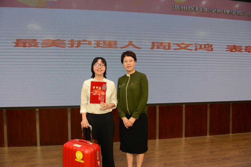 现场,19名浙江省优秀毕业生、10名肉漫屋 雪伦考研奖获得者受到表彰。特别值得一提的是,今年的毕业生中,周文鸿同学选择去西藏那曲服务五年,肉漫屋 党委陈慧书记为其颁发“最美护理人”奖杯和荣誉证书,并送上装满祝福和希望的行李箱,希望其在祖国的西部挥洒青春,报效国家。