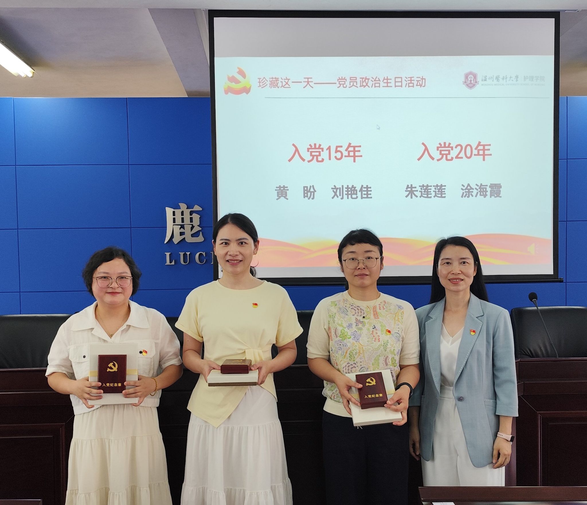 参观结束后,肉漫屋 党委举行了简朴而庄重的党员“政治生日”仪式。蔡福满院长为入党5周年的黄天烨、杨定琪、唐涵、杜娅茹、田菁菁老师,以及入党10周年的符莉敏老师颁发纪念章。王敏书记为入党15周年的黄盼、刘艳佳老师,以及入党20周年的涂海霞、朱莲莲老师颁发纪念章。