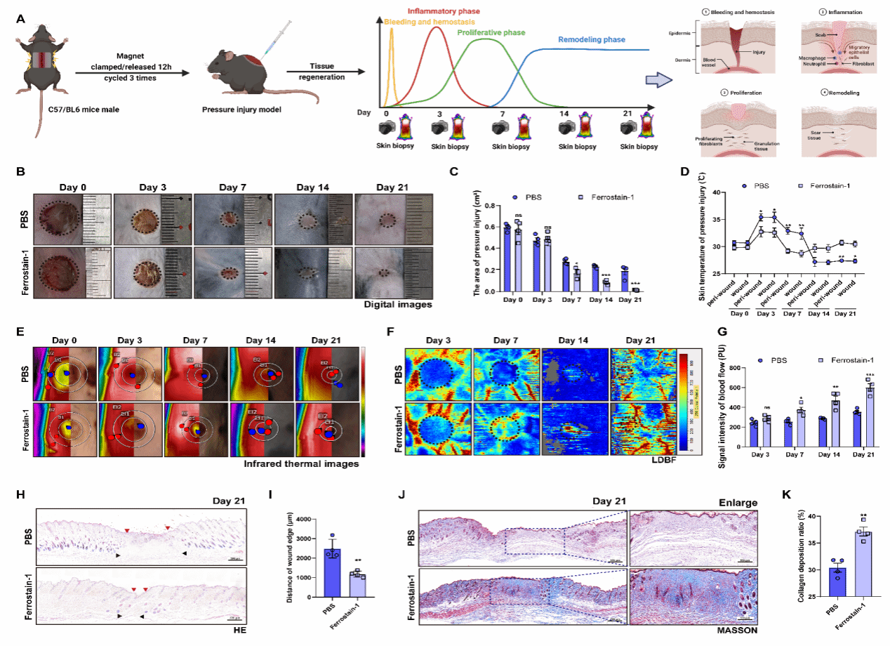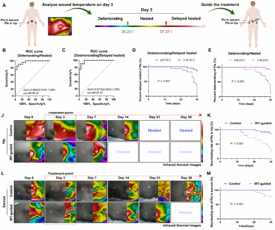 压力性损伤(旧称压疮或褥疮)是临床护理工作的重大挑战,也是老龄化社会背景下的全球性健康难题,但其修复机制及有效护理干预策略仍亟待突破。该研究应用红外热成像技术对21例临床压力性损伤患者的愈合过程进行前瞻性随访30天,分析不同愈合结局的伤口温度变化规律,并对100例临床压力性损伤患者愈合护理干预的最佳温度窗口期进行了量化。同时,为深入了解护理干预策略的内在机理,该研究结合压力性损伤小鼠模型,探讨了伤口温度与慢性炎症之间的分子关联机制,证实红外热成像技术引导的巨噬细胞铁死亡调控可有效打破炎症恶性循环,从而加速伤口组织修复。