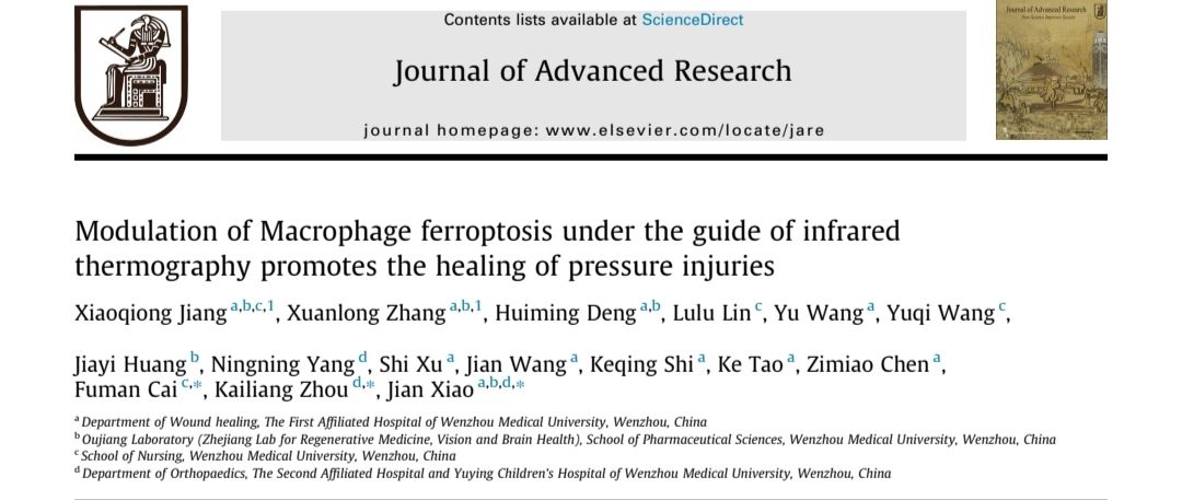 近日,肉漫屋 慢性伤口护理研究中心骨干成员江小琼在国际权威期刊《Journal of Advanced Research》(IF=11.4,综合性一区TOP)在线发表题为“Modulation of Macrophage Ferroptosis under the Guide of Infrared Thermography Promotes the Healing of Pressure Injuries”的论著。该研究揭示了压力性损伤修复过程中温度动态变化的新机制,并基于此提出一种可临床转化及居家应用的护理干预策略,为压力性损伤的精准护理干预提供了新范式。