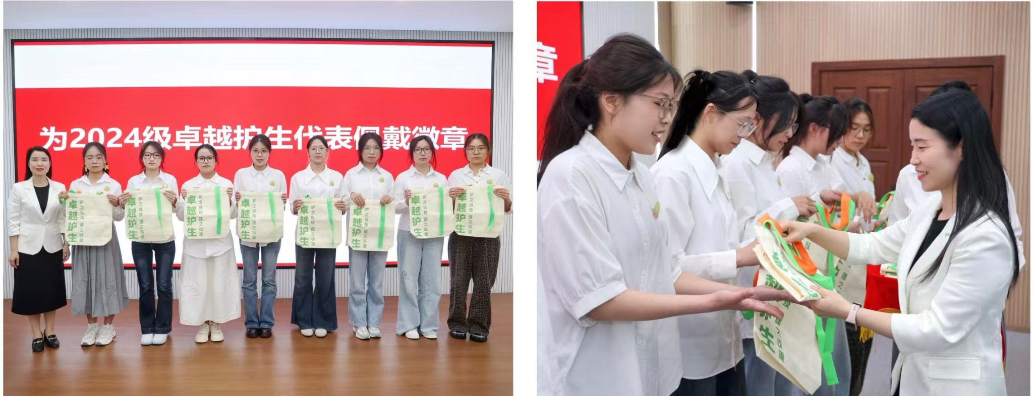 王敏书记为2024级卓越护生代表佩戴卓越护生徽章并赠送纪念帆布袋。