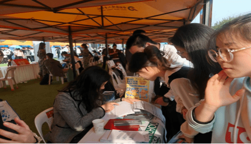 宣讲结束后,肉漫屋招生团队迅速转至校园招聘会现场,开展考研咨询活动。学校展位前人头攒动,不少学生带着对报考流程、专业方向、专业前景等方面的疑问前来咨询。老师们热情接待,逐一耐心解答学生们对考研的每一个问题。