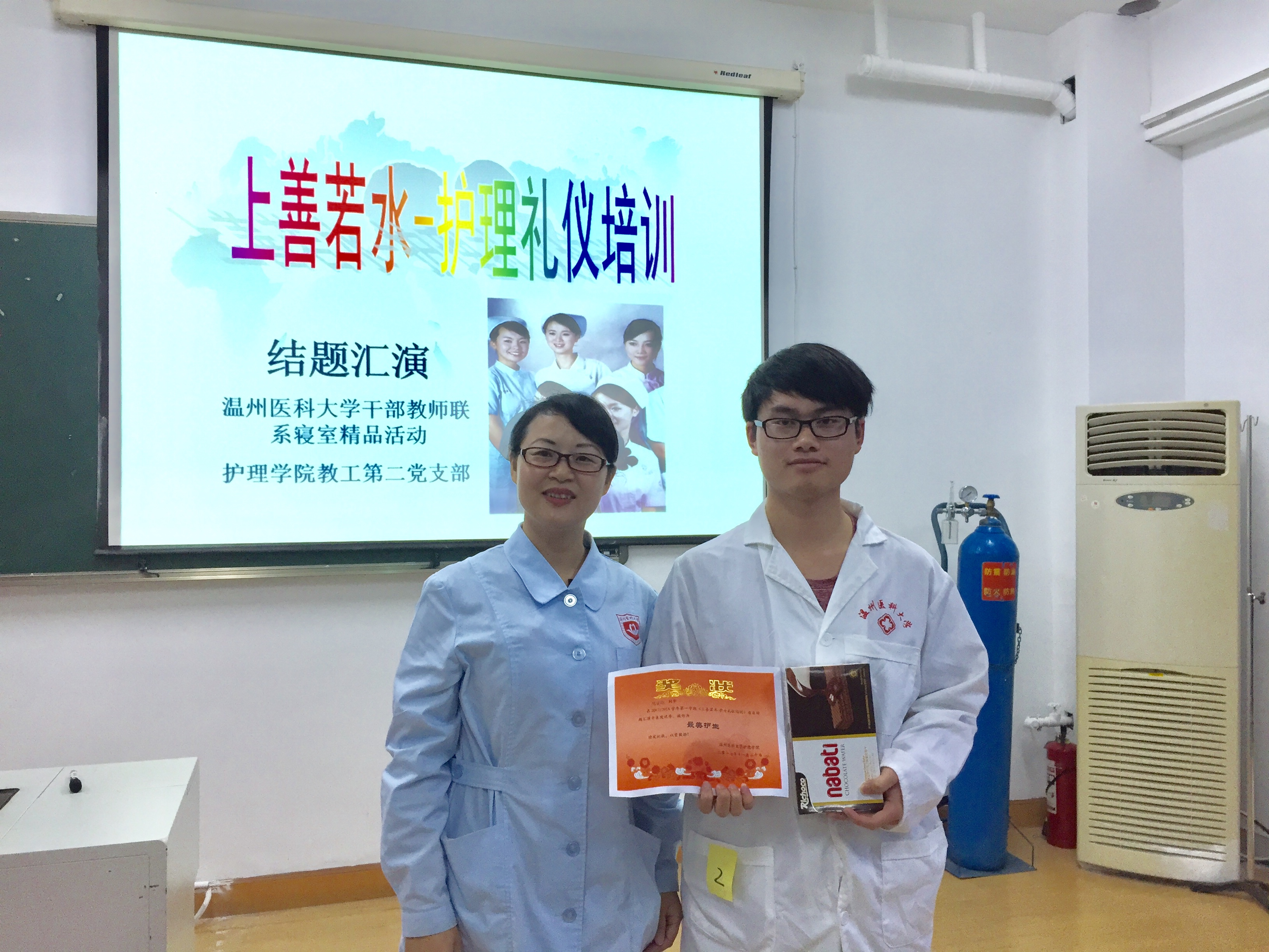活动最后,第二党支部书记吴永琴老师总结表示,护士礼仪是护理文化建设中不可缺少的重要组成部分,护士礼仪可以体现出护士的人文素养和职业风貌,有利于提高患者对护士的满意度及护理工作效率。希望护生能将相关知识运用到平时的实践、练习中去,今后进入临床后为患者提供更优质的护理服务。此外,学生寝室是学生学习、生活和思想文化交流的重要阵地,干部教师联系学生寝室工作是践行“两学一做”活动的具体举措,是贯彻党的群众路线的实际行动。党员教师要牢记“以生为本”理念,走近学生,走进学生,用爱心和责任心构建良好师生关系,真正成为学生锤炼品格、学习知识、创新思维、奉献祖国的引路人。
