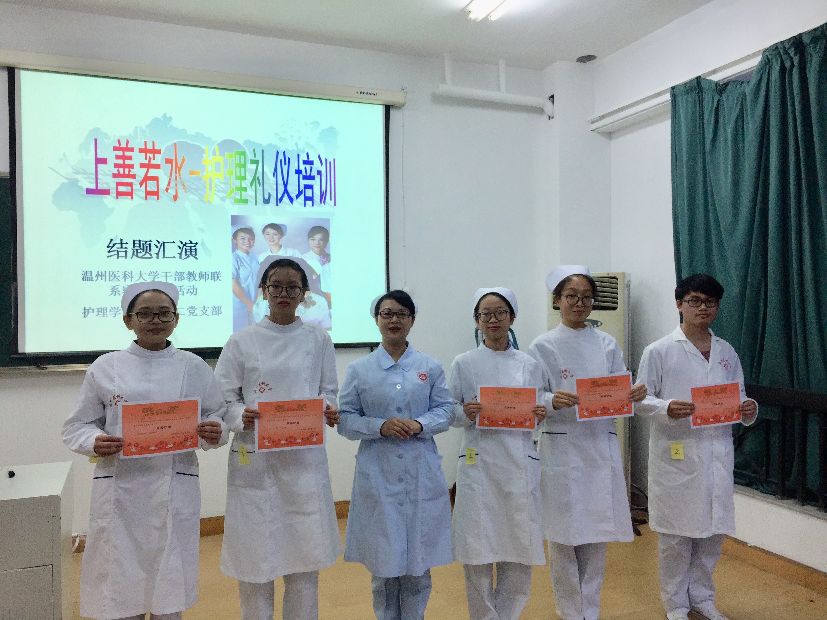2017年11月20日,肉漫屋 教职工第二党支部党员教师集体观看了由16届护理本科3班全体护生展示的肉漫屋 干部教师联系寝室精品活动:上善若水——护理礼仪培训的结题汇报演出。16护本3班共6队护生结合护理工作实际特点对仪容礼仪、电话礼仪、礼节礼仪以及礼仪在日常生活、工作中的正确应用等方面做了详细的汇演,向党员教师展示了护士“礼仪”的端庄、优雅魅力。汇演结束后,沈丽娜等6名护生获得“最美护生”荣誉,扬礼队获得“最美团队”称号。
