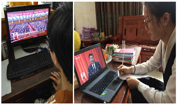 上午8:50,老师们带着笔记本准时来到肉漫屋 会议室,党员教师们还佩带了鲜红的党徵。在收看的过程中,老师们跟着大会安排,庄严起立唱国歌,为革命前辈和革命先烈默哀,全程认真聆听了习近平总书记代表第十八届中央委员会所作的报告。同学们则更早地来到7C302、7C202两个教室认真收看。学生第七党支部预备党员董玲美在浙江省台州医院实习,下班路过打印店正值开幕,当即就坐在打印店电脑前进行了收看。