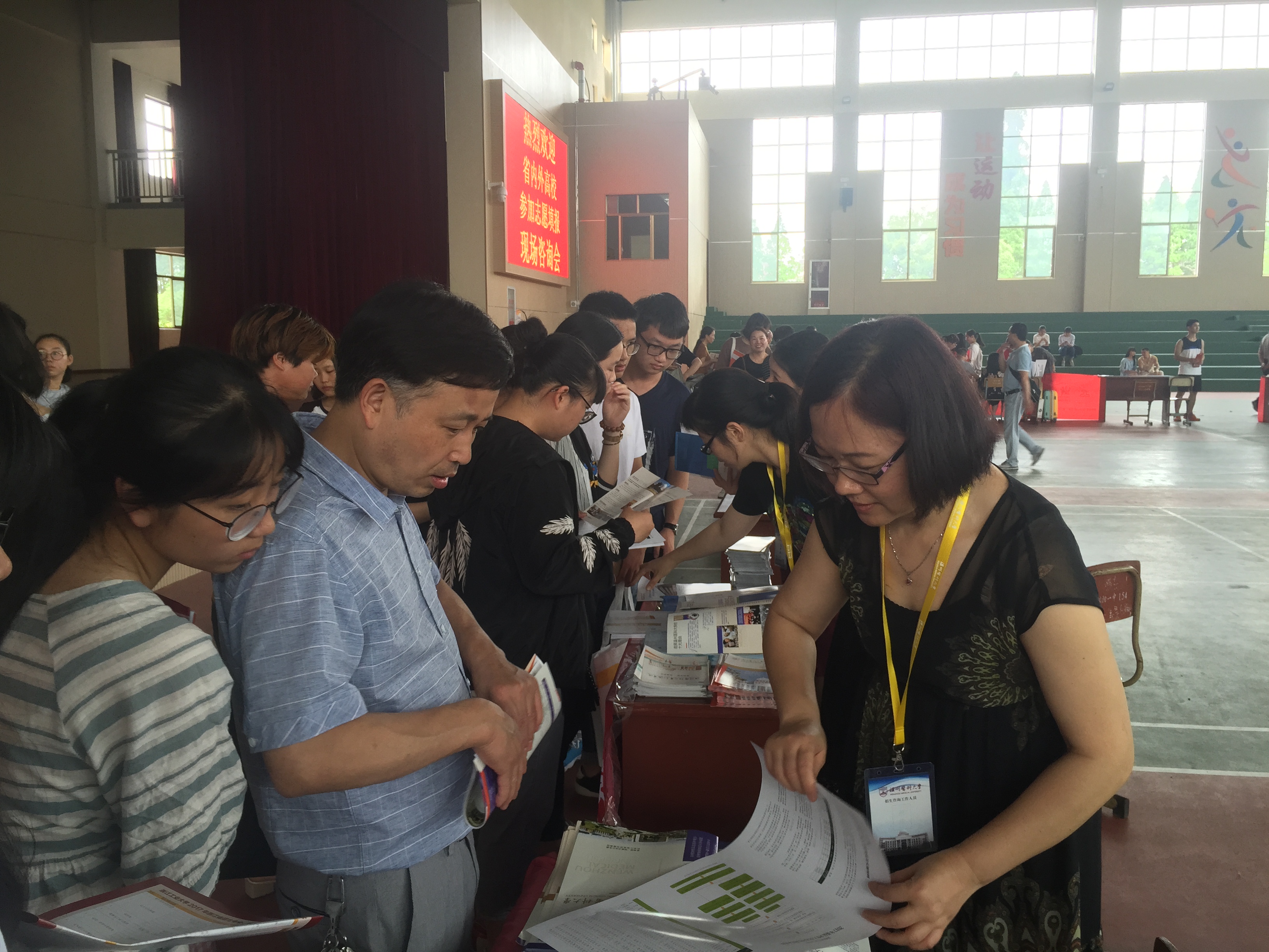 在松阳县第一中学体育馆,4位老师进行了现场资料发放、现场咨询等服务。当天由该校组织的高考志愿填报现场咨询会场面火爆,高考考生、非高三学生及家长对我校表现出十分浓厚的兴趣,尤其关注我校的医学专业、有关专业发展前景以及仁济肉漫屋 的定向招生政策,纷纷前来咨询。各位老师一一作了详细的解答和介绍。事先准备的300份招生宣传资料很快发放完毕。