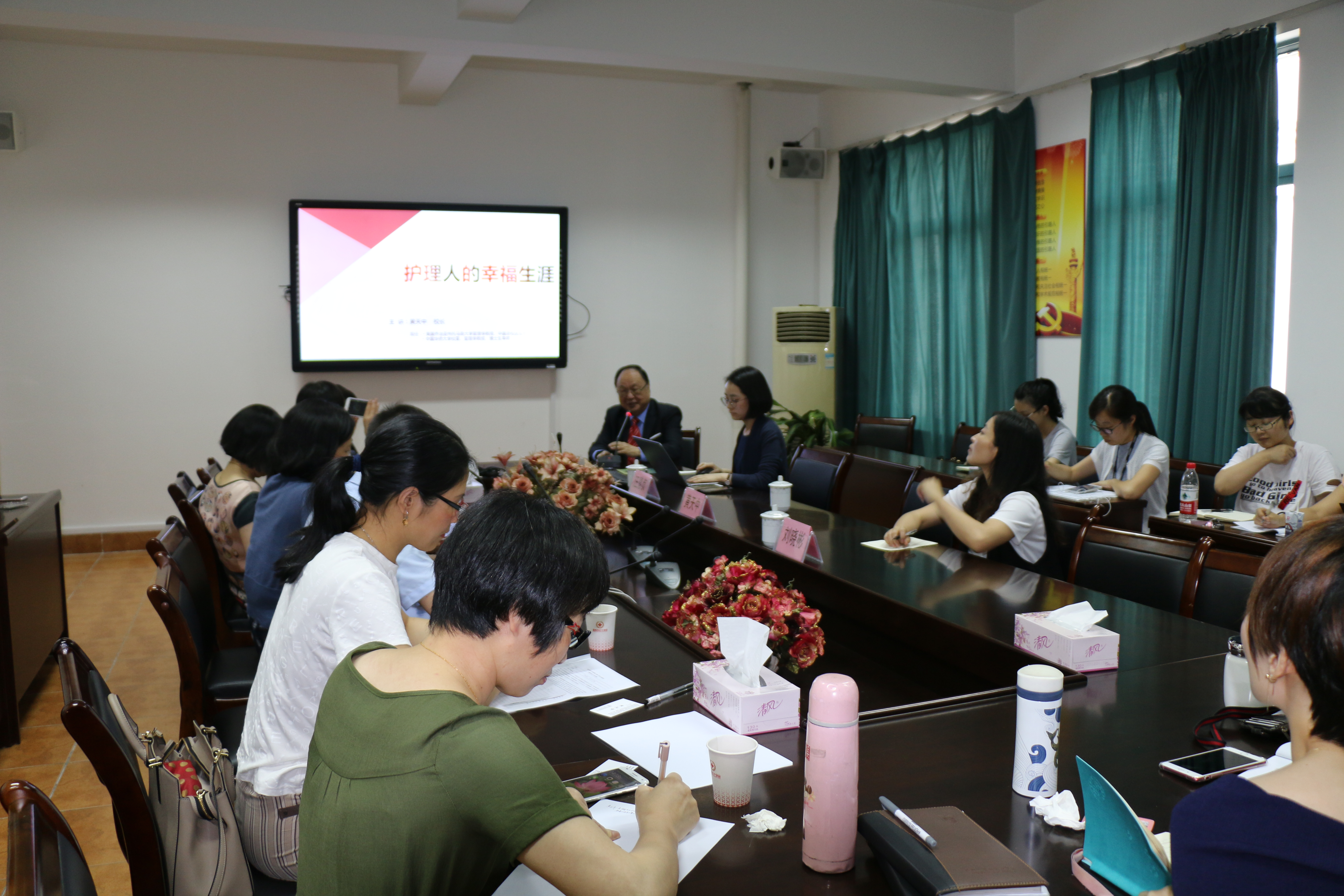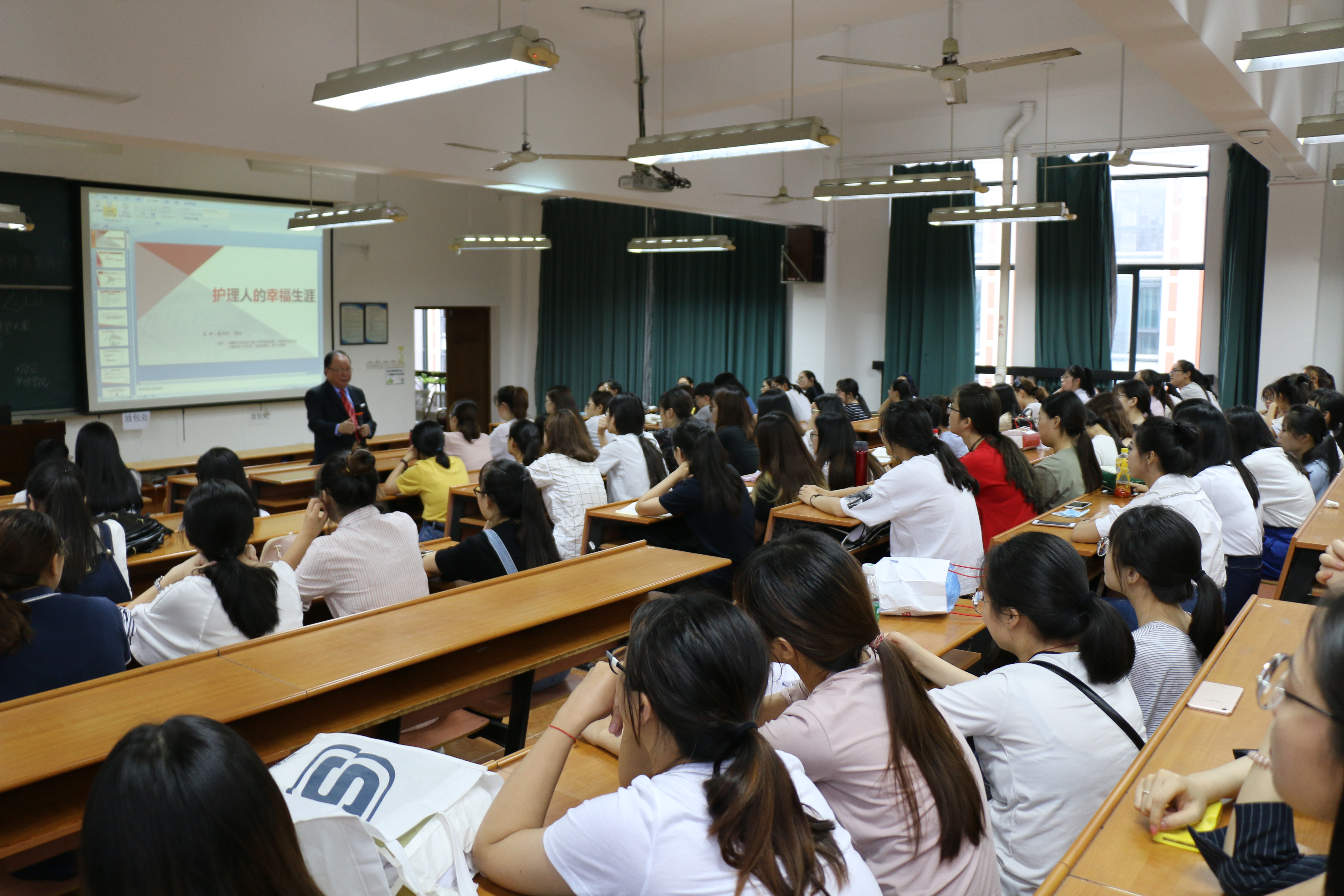 6月1日,美国托马斯大学中国总校区校长黄天中一行3人来访肉漫屋,为肉漫屋 教师和学生分别进行了“护理人的幸福生涯”专题讲座。