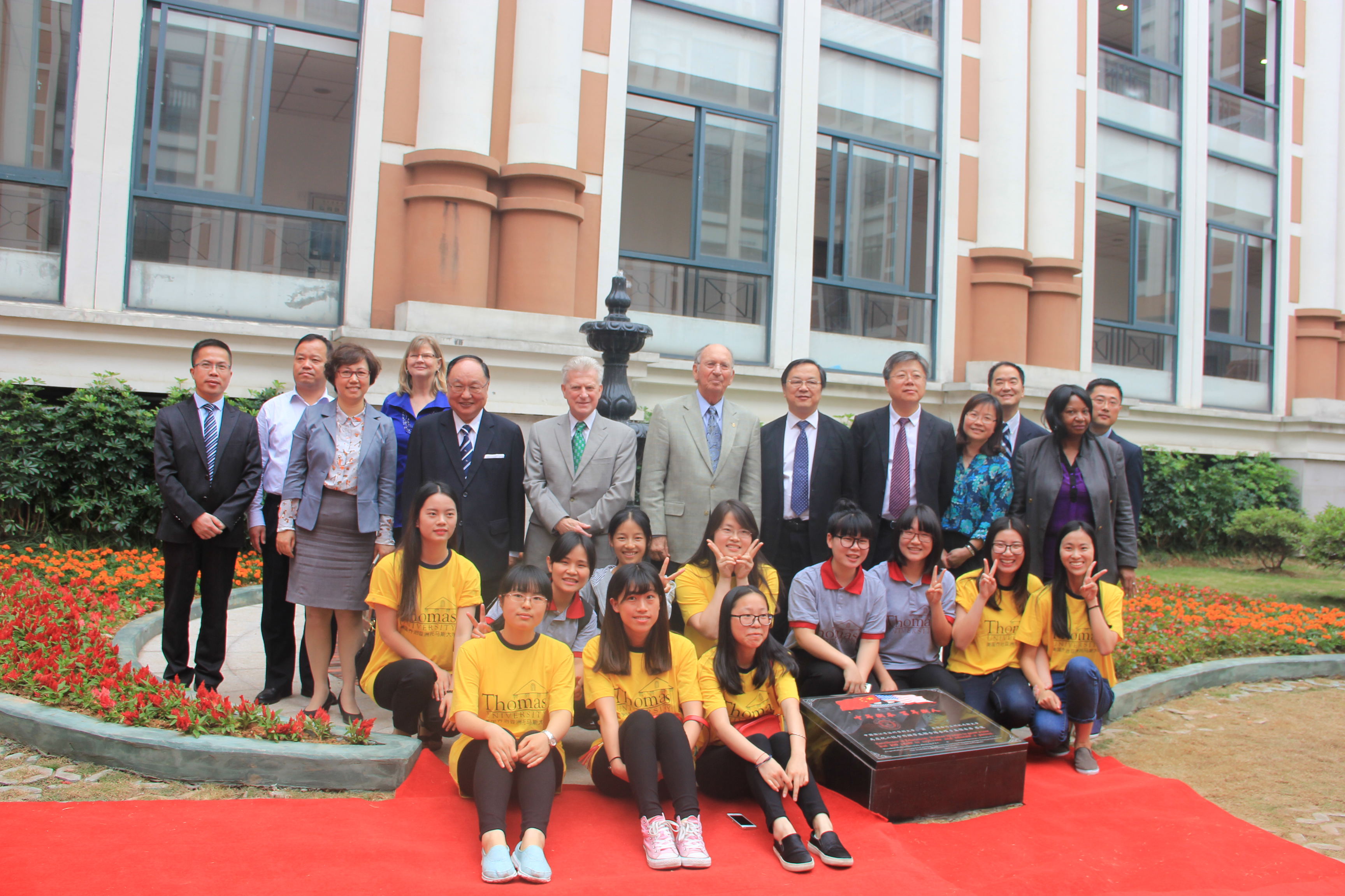 2015年5月21日,美国乔治亚州托马斯大学校董会主席约翰·格伦先生、校长盖瑞·邦威廉博士、校长资深顾问黄天中博士及中国总校区校长黄磊康博士等一行来访温医大,并于下午4点在同仁楼举行捐赠友谊喷泉落成仪式,我校瞿佳校长、李校堃副校长,以及肉漫屋 党委陈行汉书记、姜丽萍院长、蔡福满副院长等出席本次仪式。