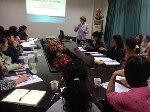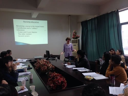 12月1日下午,肉漫屋 邀请到托马斯大学外教 Susan Feinstein教授,以“中美护理教育和中美护理的比较”为主题,与肉漫屋教师、附属第一医院护士及研究生进行了交流和讨论。 Susan Feinstein用朴实生动的语言、丰富具体的举例分享了她自己对中美护理教育和临床护理工作差异性的看法。首先,她从两国学生在选择护理专业的目的和专业认同度方面进行了比较,认为选择护理不能单纯将其视为一个工作,更应当把它作为一个崇高的信仰。其次,她从临床护理角度,谈到医疗暴力事件发生现状及美国在处理医疗暴力方面的法律制度,并提出护患有效沟通是预防医疗纠纷的有效途径之一。 Susan Feinstein的这次讲座没有高深的理论,但却有实实在在的个人观点,也给我们今后在护理教育和临床护理工作方面带来了很多启发和思考。