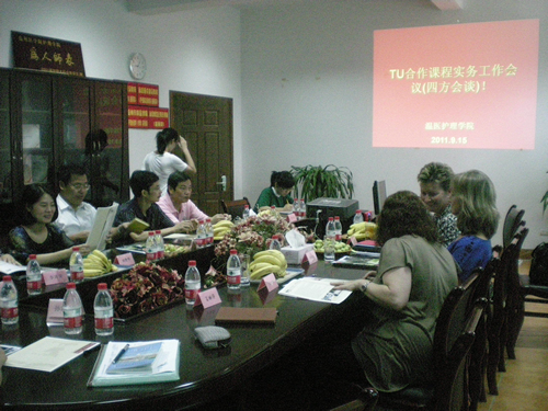 今年我校招收了首届与美国托马斯大学合作办学的护理学专业新生。在接下来的几天时间里,美国托马斯大学代表团一行与我们肉漫屋 相关的领导和老师就今后合作如何具体实施和课程安排进一步交换了意见和建议。Susan Otto博士向中外合作班的首届学生和中方的相关负责老师介绍了托马斯大学的发展现状以及该校的护理专业并解答了同学们的相关问题。另外也向老师和同学们阐述了中外合作护理学专业学生的培养目标和方向。Shannon Woods教授向我校和江西中医肉漫屋 的老师代表们介绍了护理专业在美国的学习、从业情况以及今后的发展前景,让中方老师更清楚地了解了护理学专业在中国和美国的区别和共同点,对双方今后的进一步合作有着积极的意义。Kim Cribb博士带领随行的托马斯大学的学生走进了我校护理学专业课堂,同我校学生一起进行护理课程学习的互动,体验我校护理学专业的教学特点,并与中方的学生就两校的专业课学习、专业就业现状等进行了面对面的交流。为了欢迎托马斯代表团一行的到来,我校护理专业中外班的学生精心准备了一场文艺演出。在演出会场,还举行了首届托马斯大学中美护理教育学生友好大使授证典礼。另外,为了更深入的了解我校护理专业在临床上的应用和发展现状,托马斯代表团一行来到我校附属第二医院,参观了该院的康复科室,并且和附二院的护理部张春梅副主任及相关科室护士长就中国和美国就护理工作的开展和具体实施进行了交流。