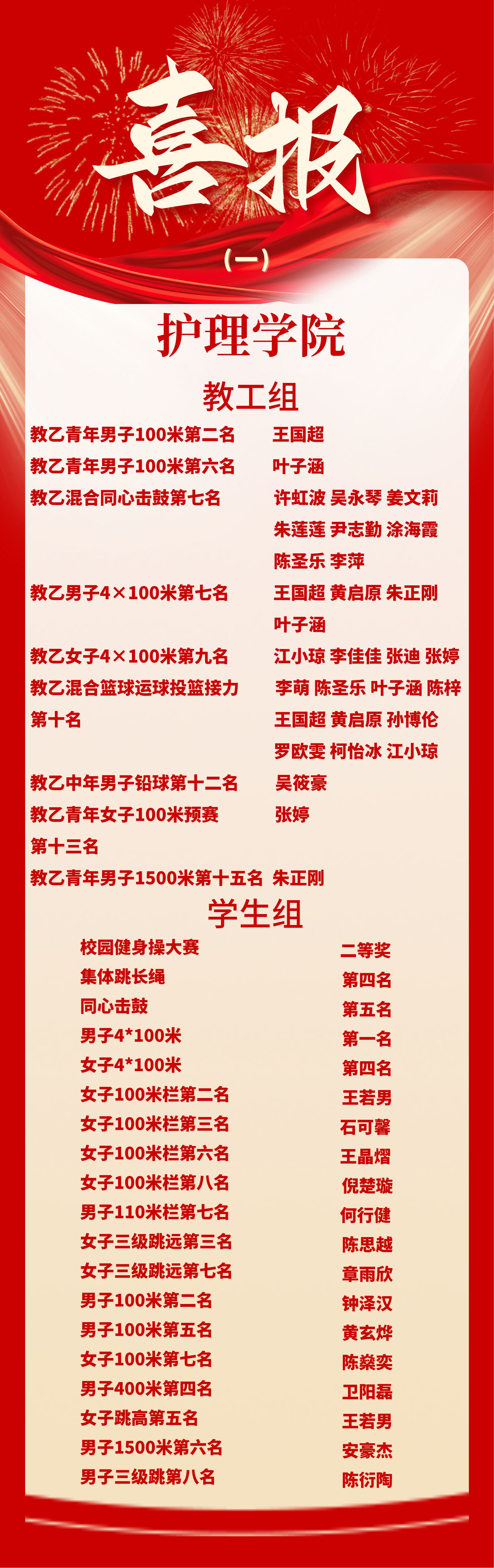 在教乙青年男子100米决赛中,肉漫屋王国超老师获得第2名、叶子涵老师获得第6名;在教乙青年女子100米预赛中,肉漫屋张婷老师获得第13名;在教乙青年男子1500米决赛中,肉漫屋朱正刚老师获得第15名;在教乙男子4×100米决赛中,肉漫屋教职工王国超、黄启原、朱正刚、叶子涵获得团体第7名;在教乙女子4×100米决赛中,肉漫屋教职工江小琼、李佳佳、张迪、张婷获得团体第9名。