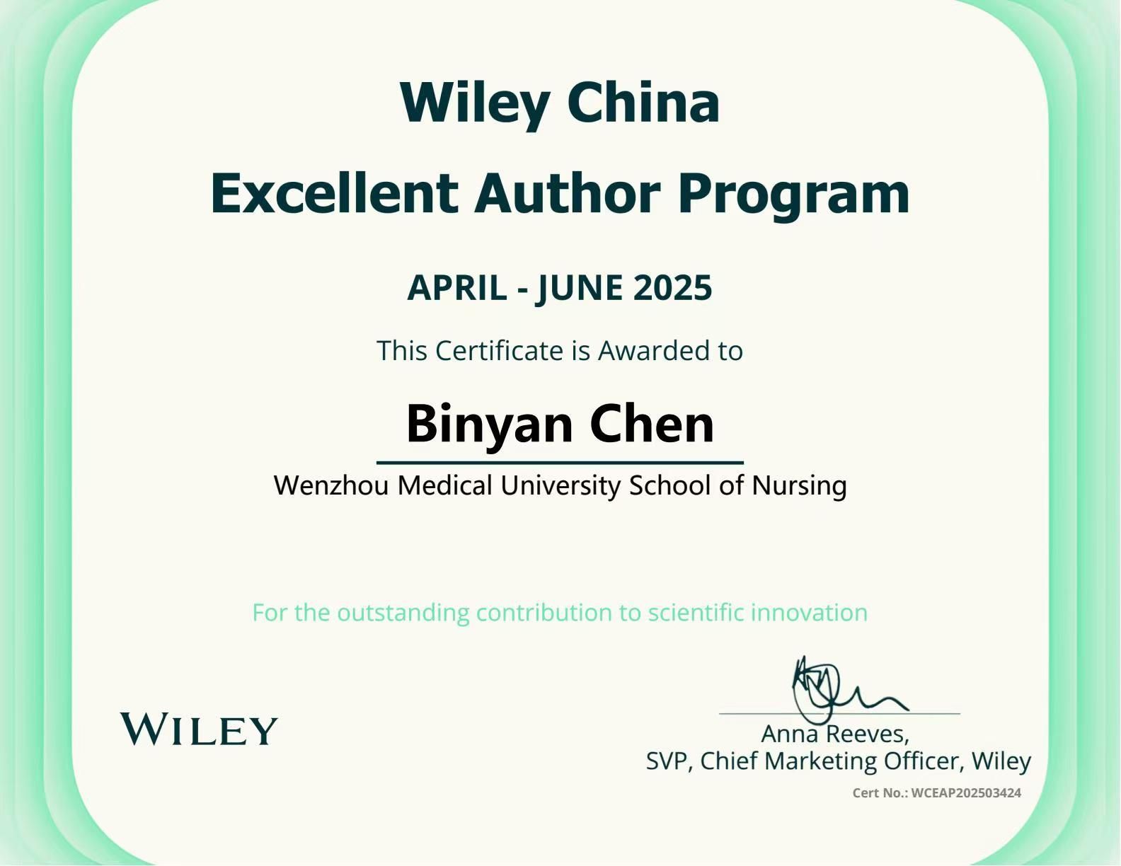 “威立Wiley中国高贡献作者奖”是为响应中国《国家“十五五”人才发展规划》中提出的创新驱动战略,深化与中国科研界的合作,支持基础研究与科技创新的全球化发展,威立Wiley统计了较受中国作者认可的Wiley期刊中由中国作者(通讯作者发文机构为中国大陆机构)发表后三个月内的所有文章全文阅读下载量,并从每本期刊中选择下载量最高的若干篇由中国作者所发表的文章,授予所有所在机构为中国大陆的中国作者“Wiley威立中国高贡献作者”,以感谢作者为科技进步做出的巨大贡献。
