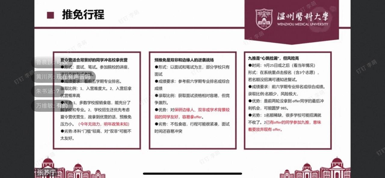 分享会上,张苏宁同学聚焦“推免全流程攻略”,从政策解读、材料准备、面试应对三大维度进行系统讲解。她结合肉漫屋 推免政策,对比分析了历年推免名额变化,帮助同学们准确把握推免形势;同时详细列出推免材料清单并提供实用模板,分享了“院校投递”“预判面试官意图”等宝贵经验,增强了同学们对推免的了解与信心。